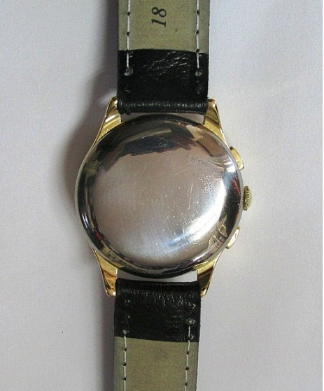Serviços Executados: Revisão geral (limpeza e lubrificação), roda de arraste do cronômetro, ajustagem, vidro, folhação da caixa e restauração do mostrador.