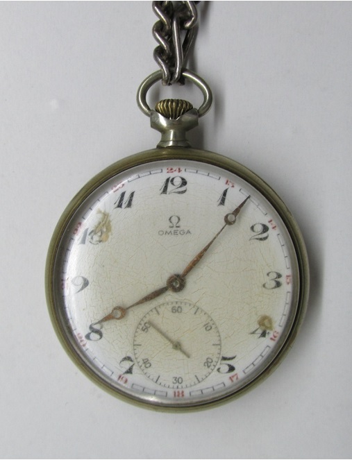 Relógio de bolso OMEGA FERRADURA nº10.563.590, caixa de níquel, mostrador de porcelana.